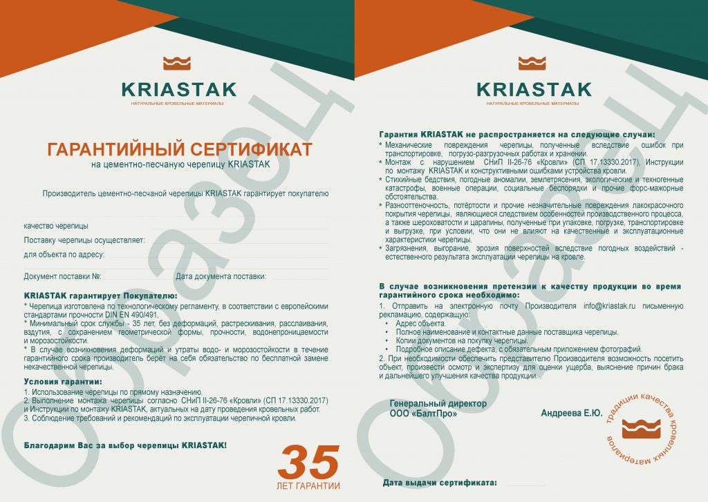 Каждый покупатель цементно-песчаной черепицы KRIASTAK имеет возможность получить именной сертификат, подтверждающий право на гарантийное обслуживание.